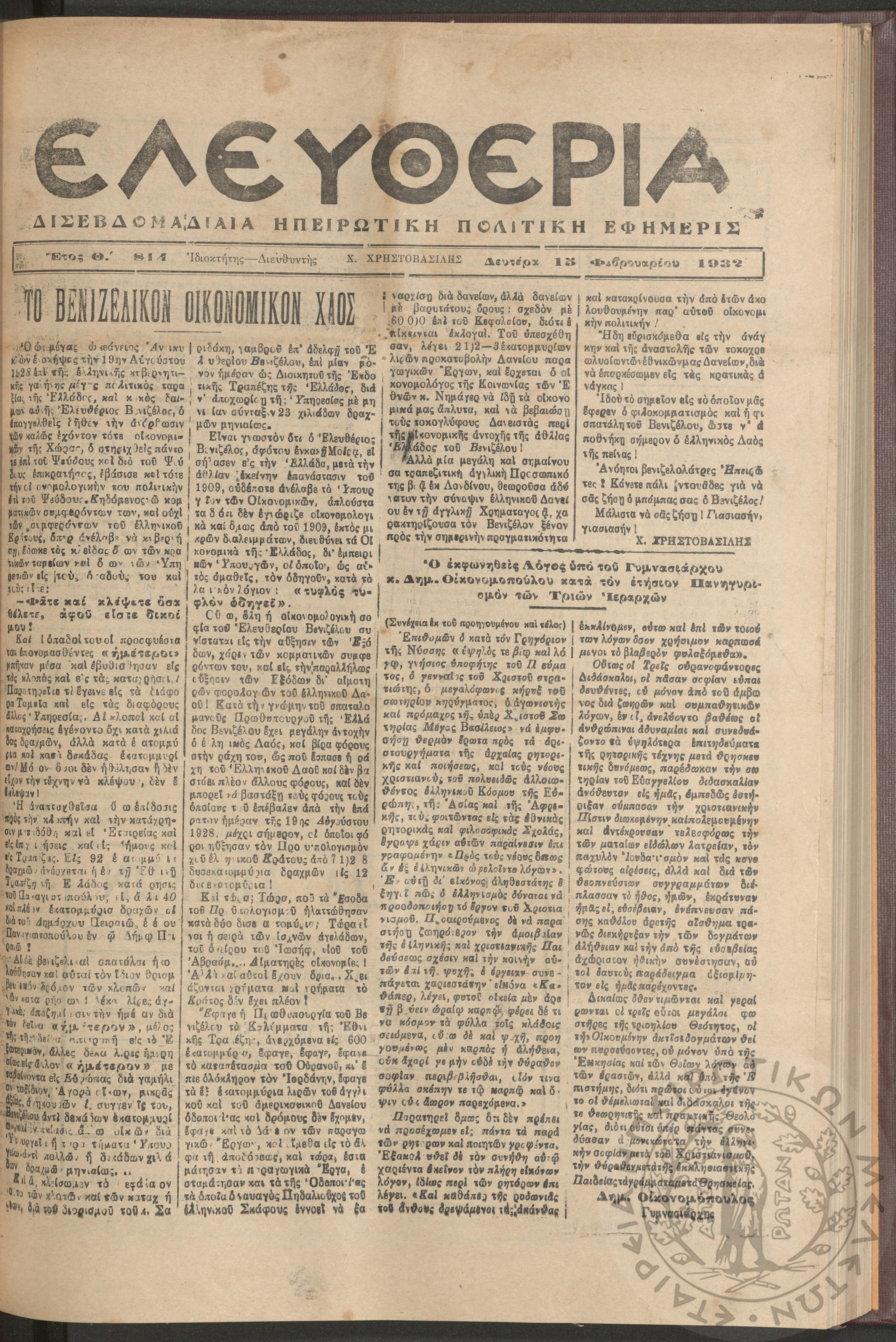 Ελευθερία: δισεβδομαδιαία Ηπειρωτική πολιτική εφημερίς, 1932, φ. 814
