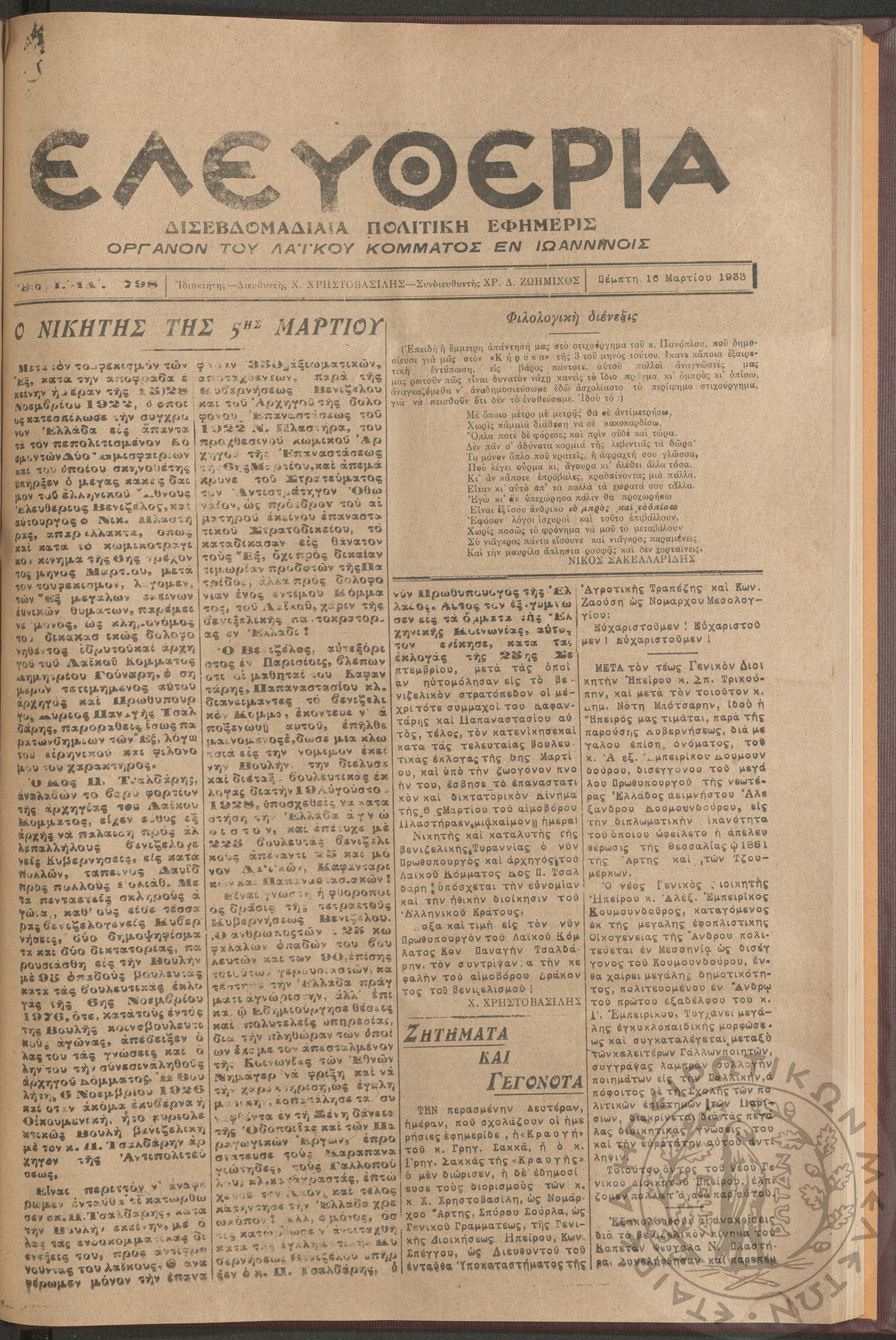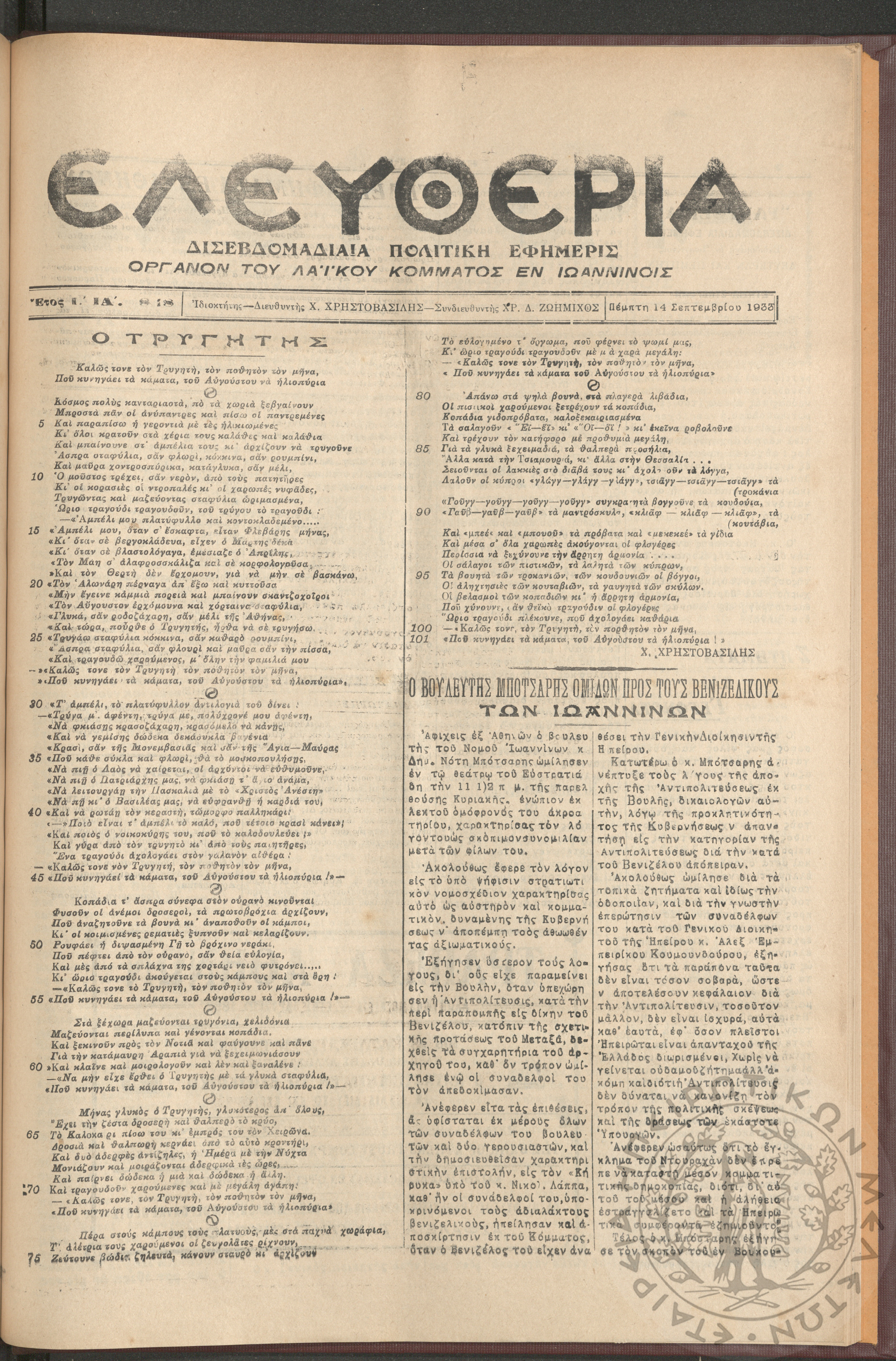 Ελευθερία: δισεβδομαδιαία Ηπειρωτική πολιτική εφημερίς, 1933, φ. 833