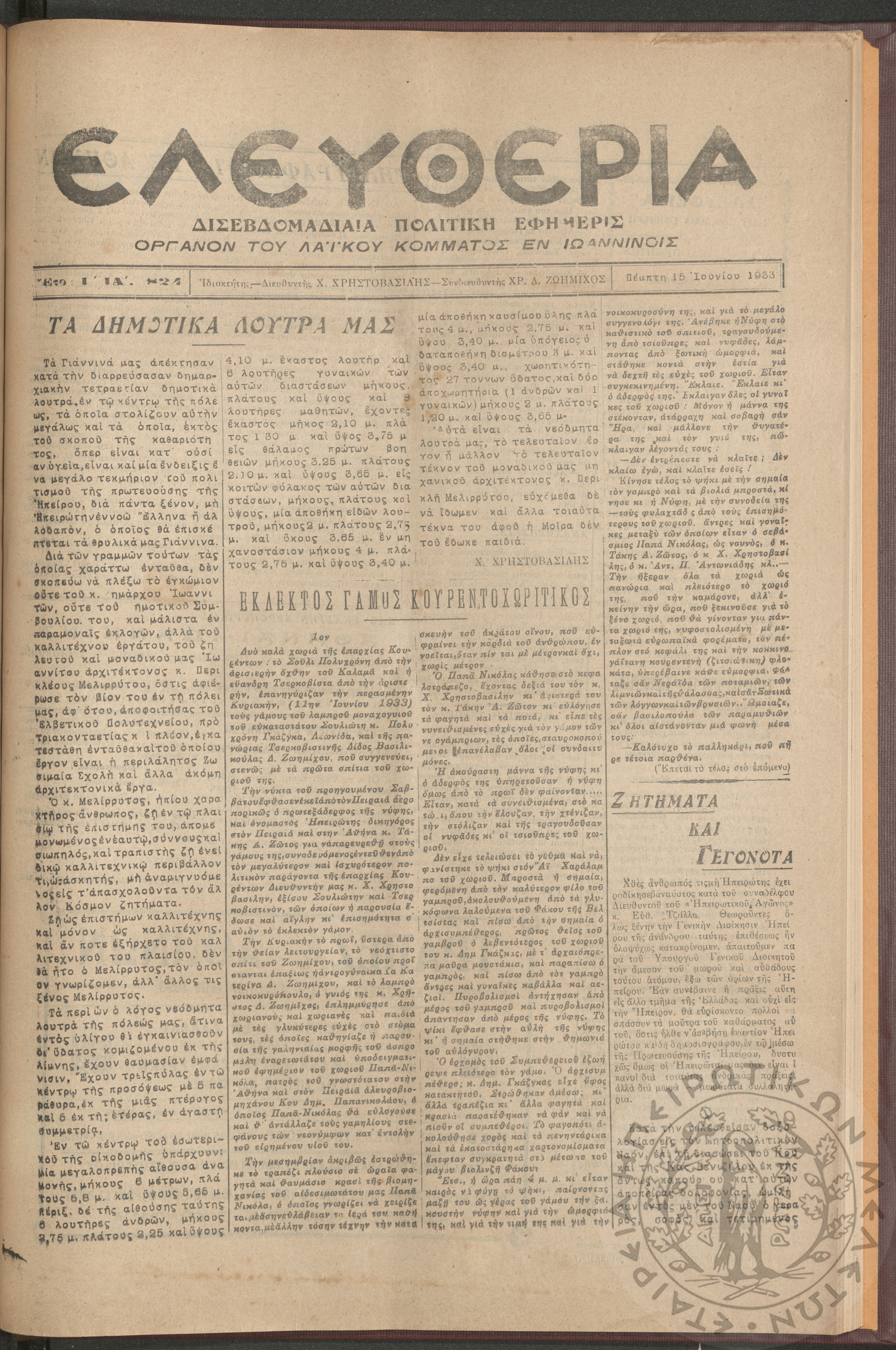 Ελευθερία: δισεβδομαδιαία Ηπειρωτική πολιτική εφημερίς, 1933, φ. 824