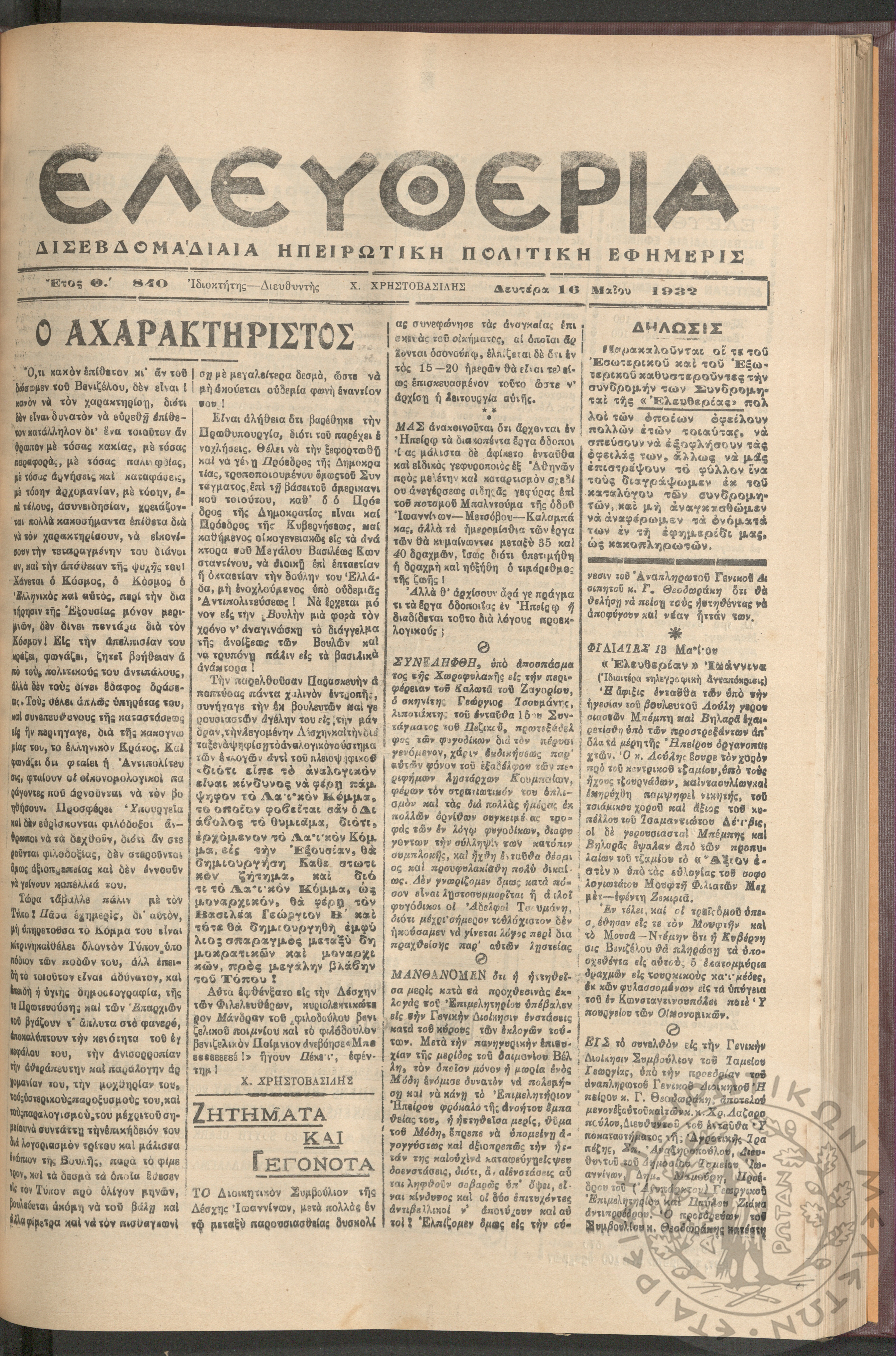 Ελευθερία: δισεβδομαδιαία Ηπειρωτική πολιτική εφημερίς, 1932, φ. 840