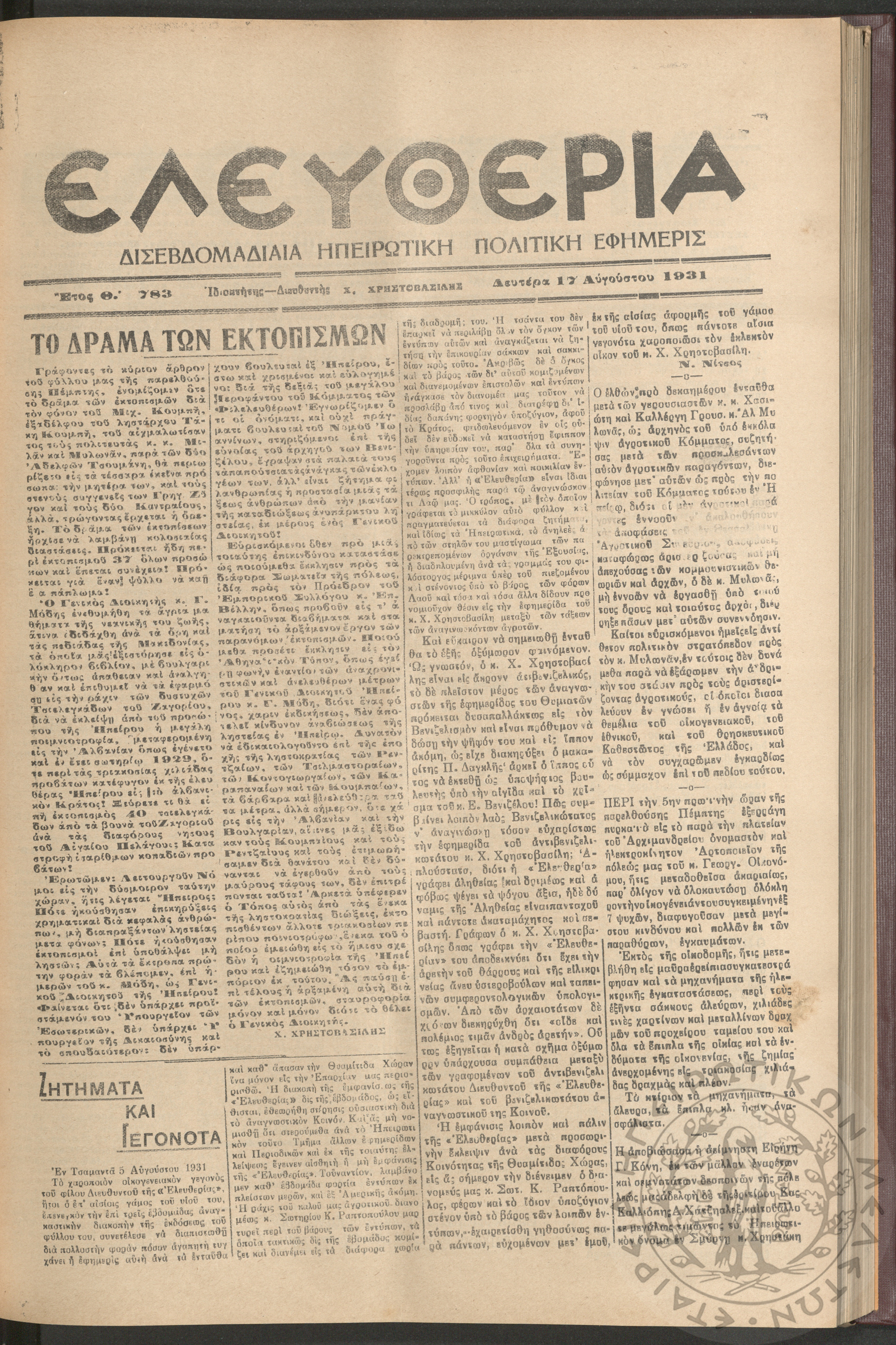 Ελευθερία: δισεβδομαδιαία Ηπειρωτική πολιτική εφημερίς, 1931, φ. 783