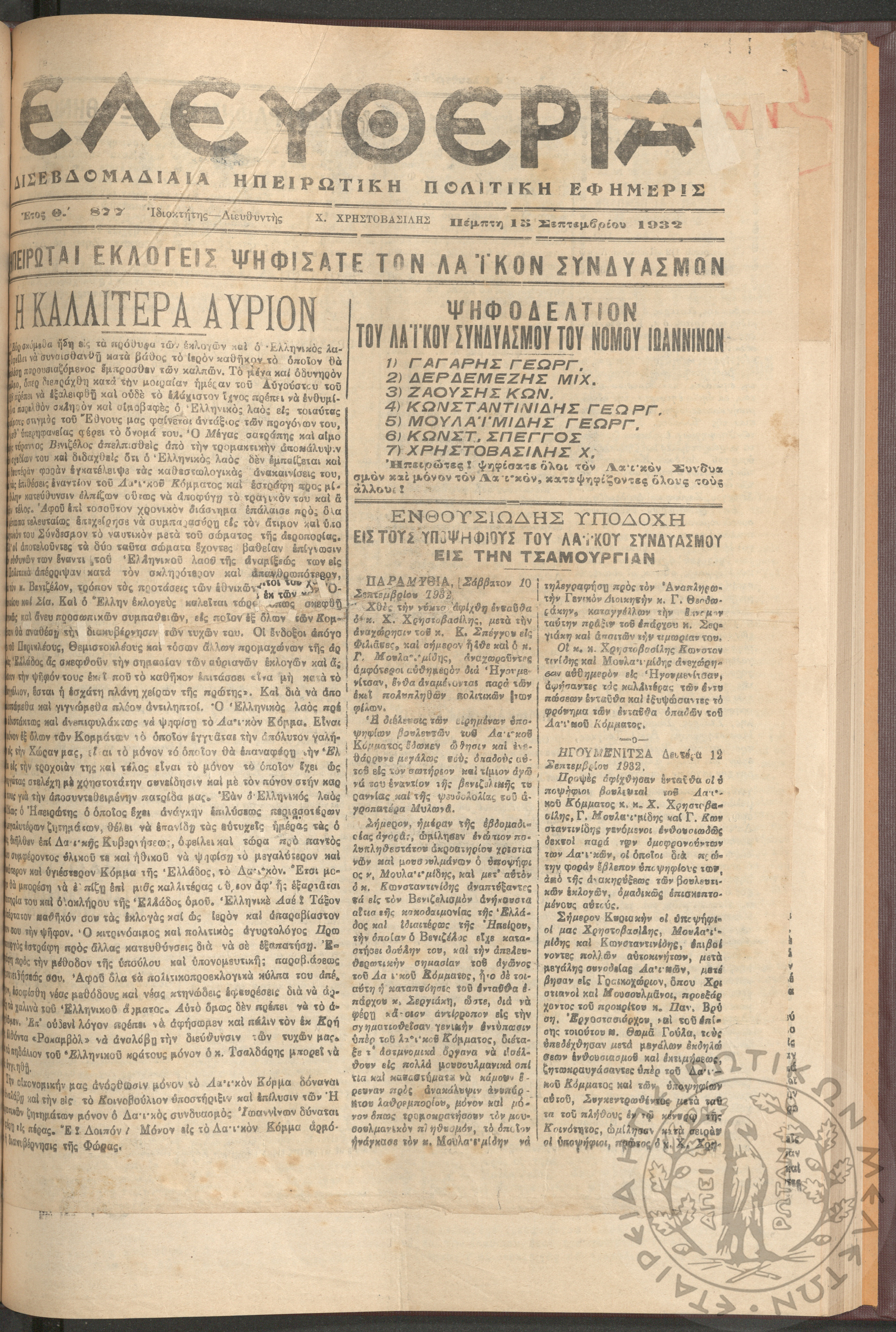 Ελευθερία: δισεβδομαδιαία Ηπειρωτική πολιτική εφημερίς, 1932, φ. 823