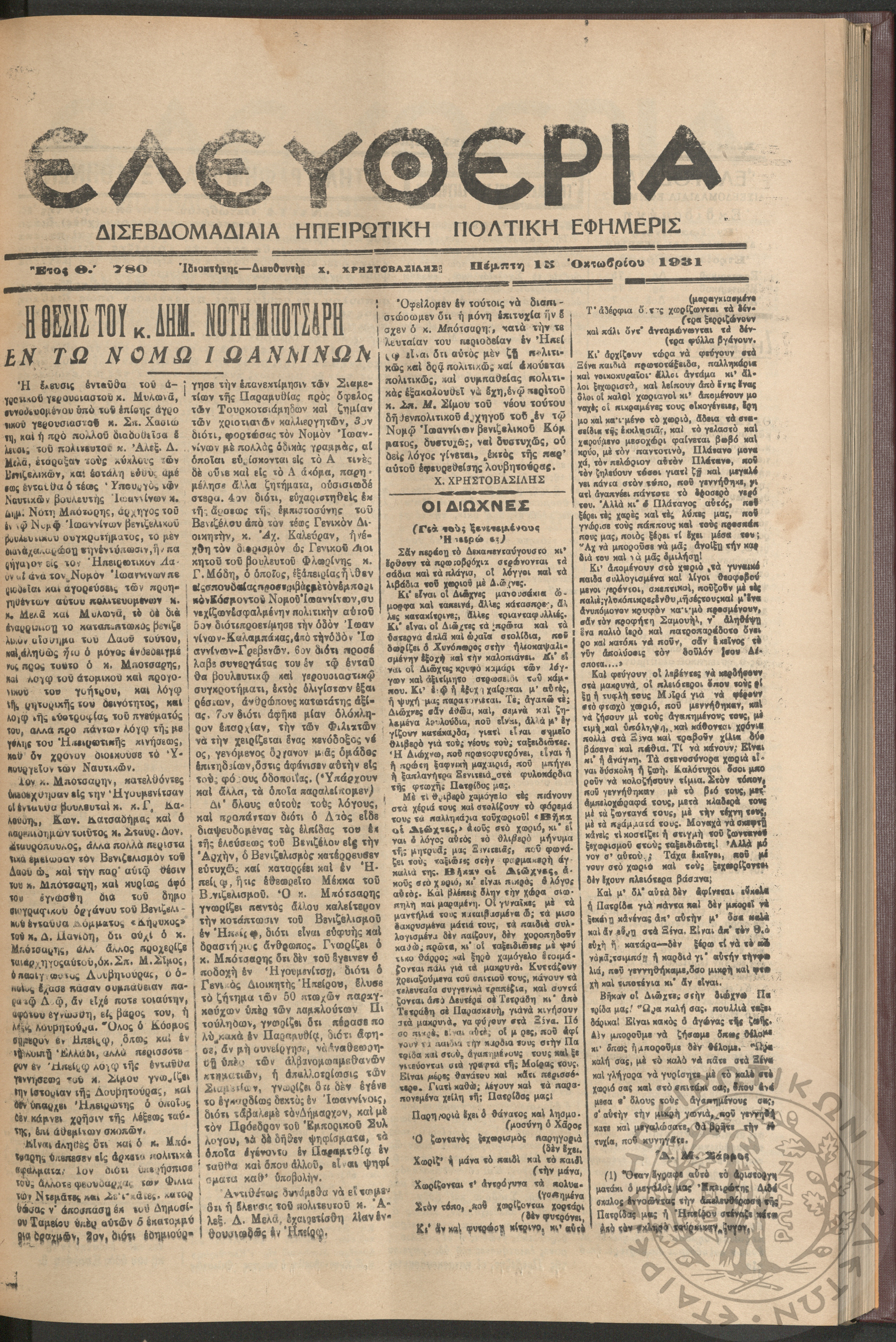 Ελευθερία: δισεβδομαδιαία Ηπειρωτική πολιτική εφημερίς, 1931, φ. 780