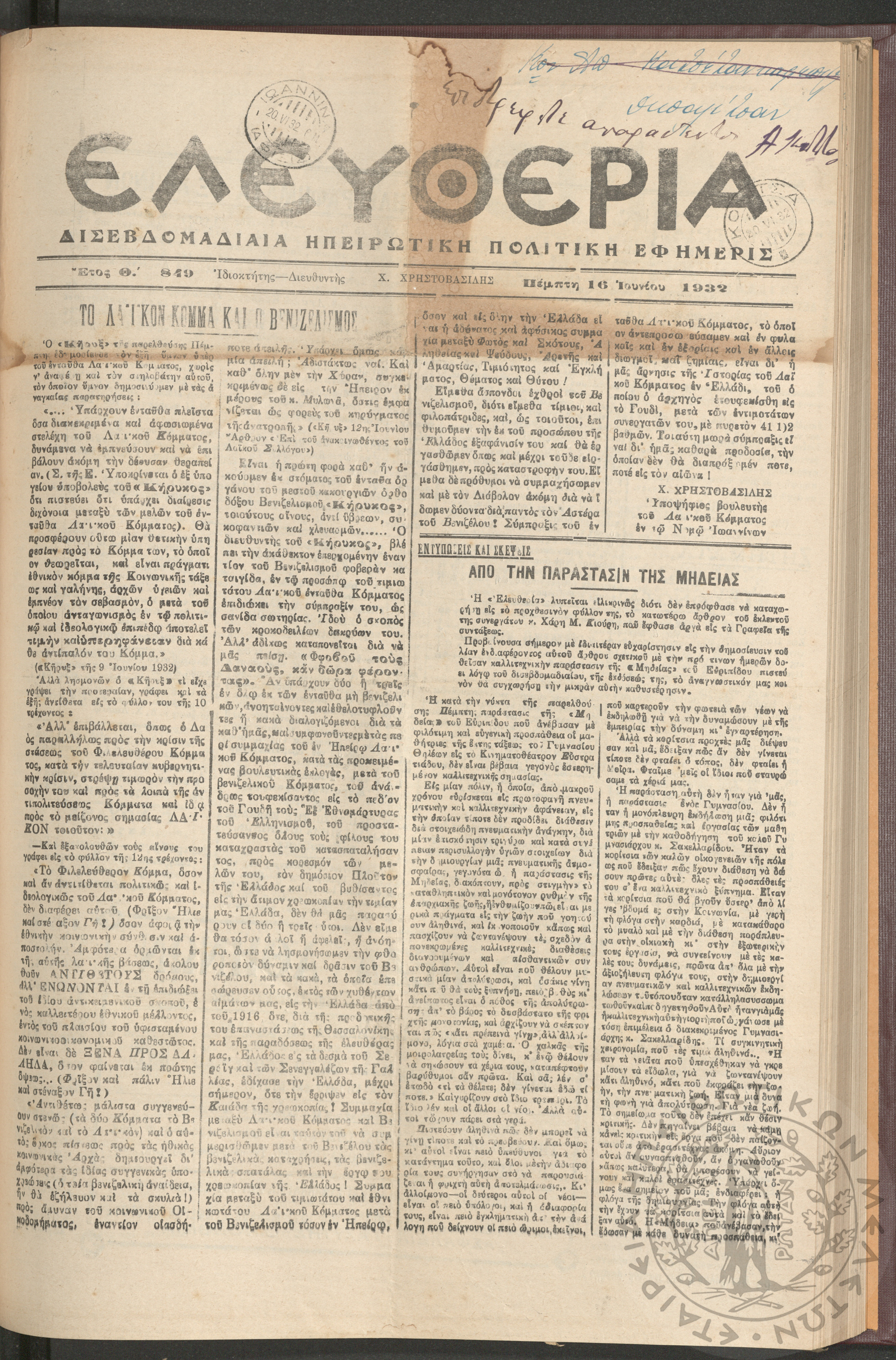 Ελευθερία: δισεβδομαδιαία Ηπειρωτική πολιτική εφημερίς, 1932, φ. 849