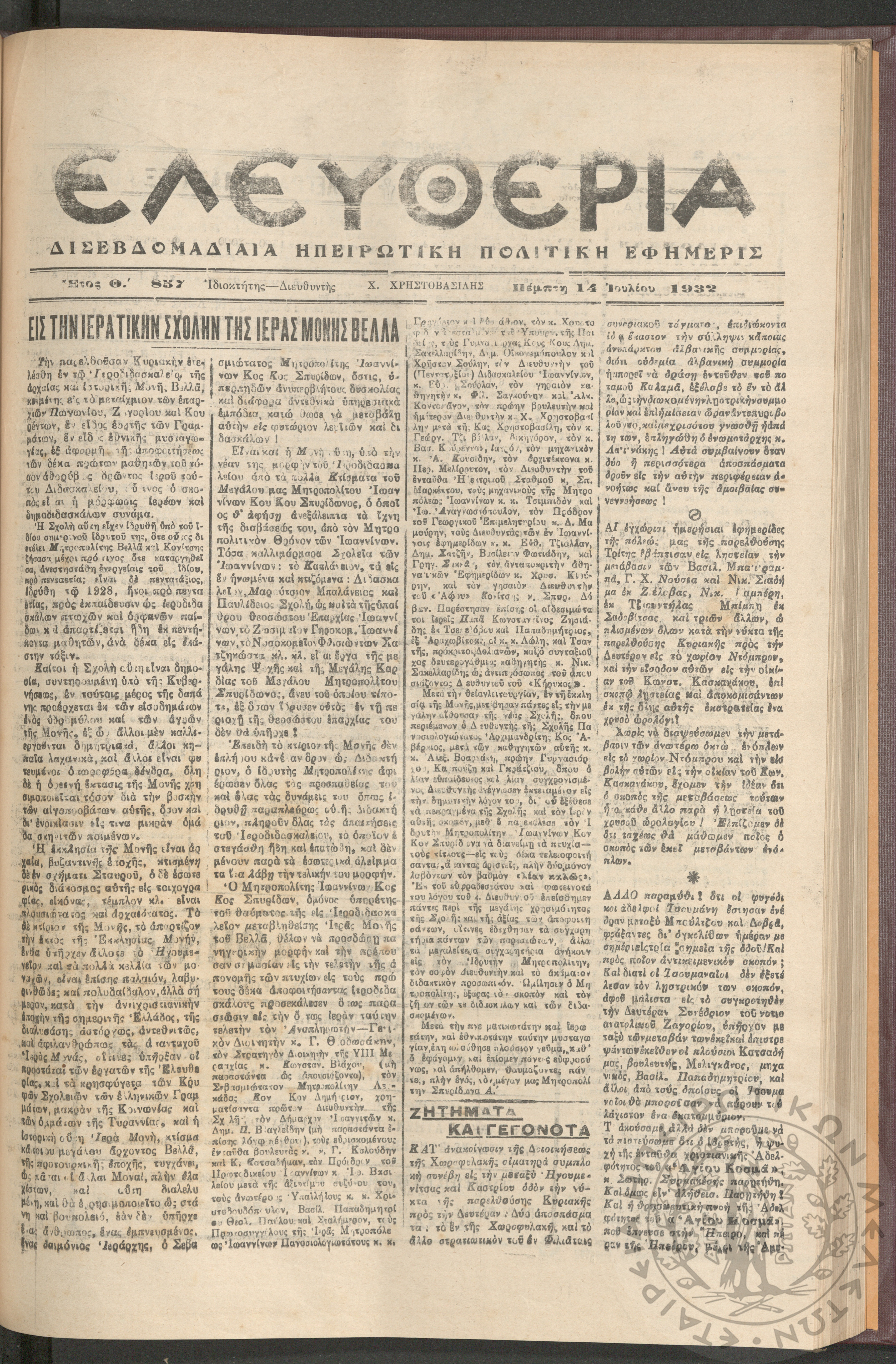 Ελευθερία: δισεβδομαδιαία Ηπειρωτική πολιτική εφημερίς, 1932, φ. 857