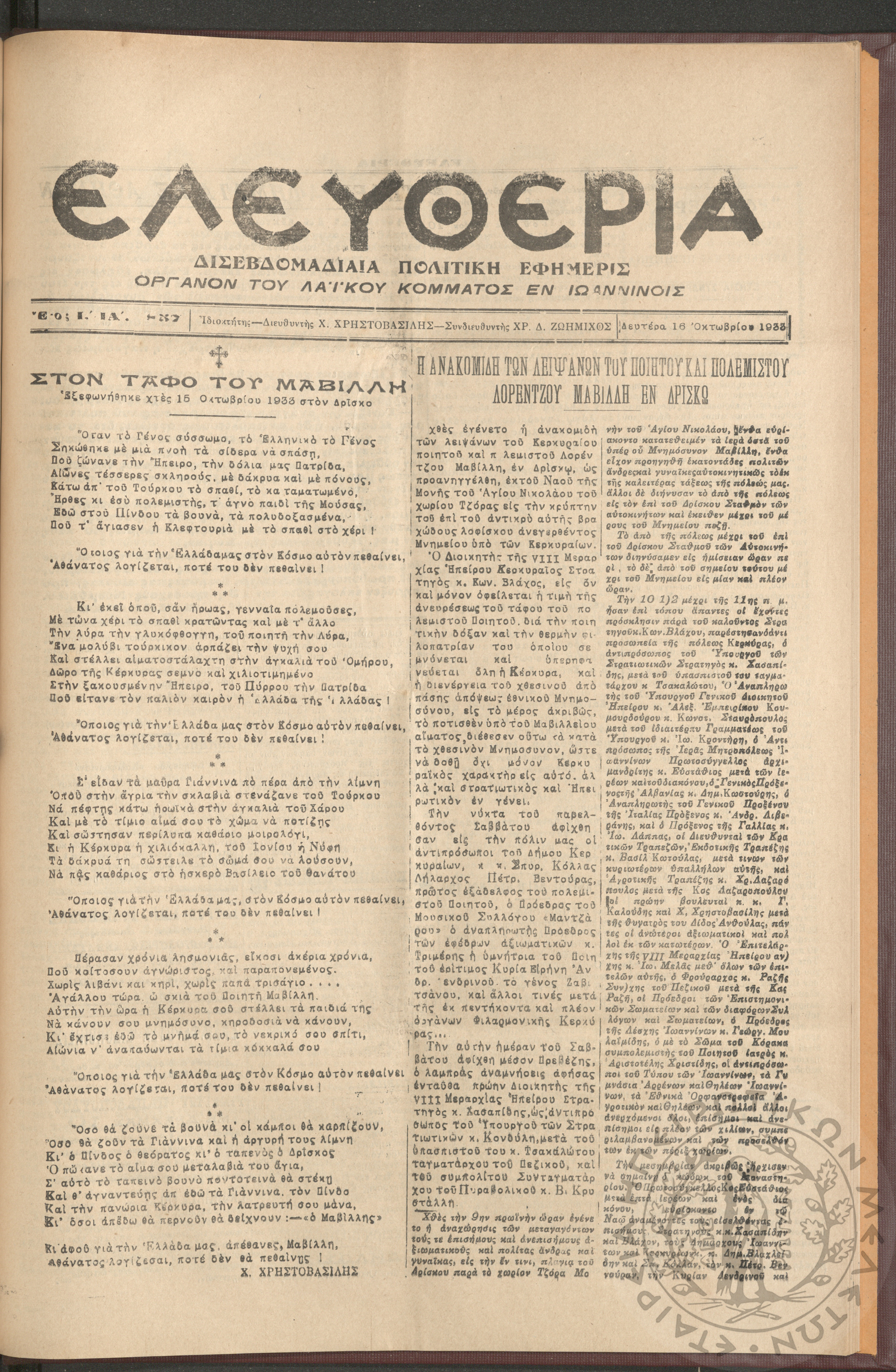 Ελευθερία: δισεβδομαδιαία Ηπειρωτική πολιτική εφημερίς, 1933, φ. 857