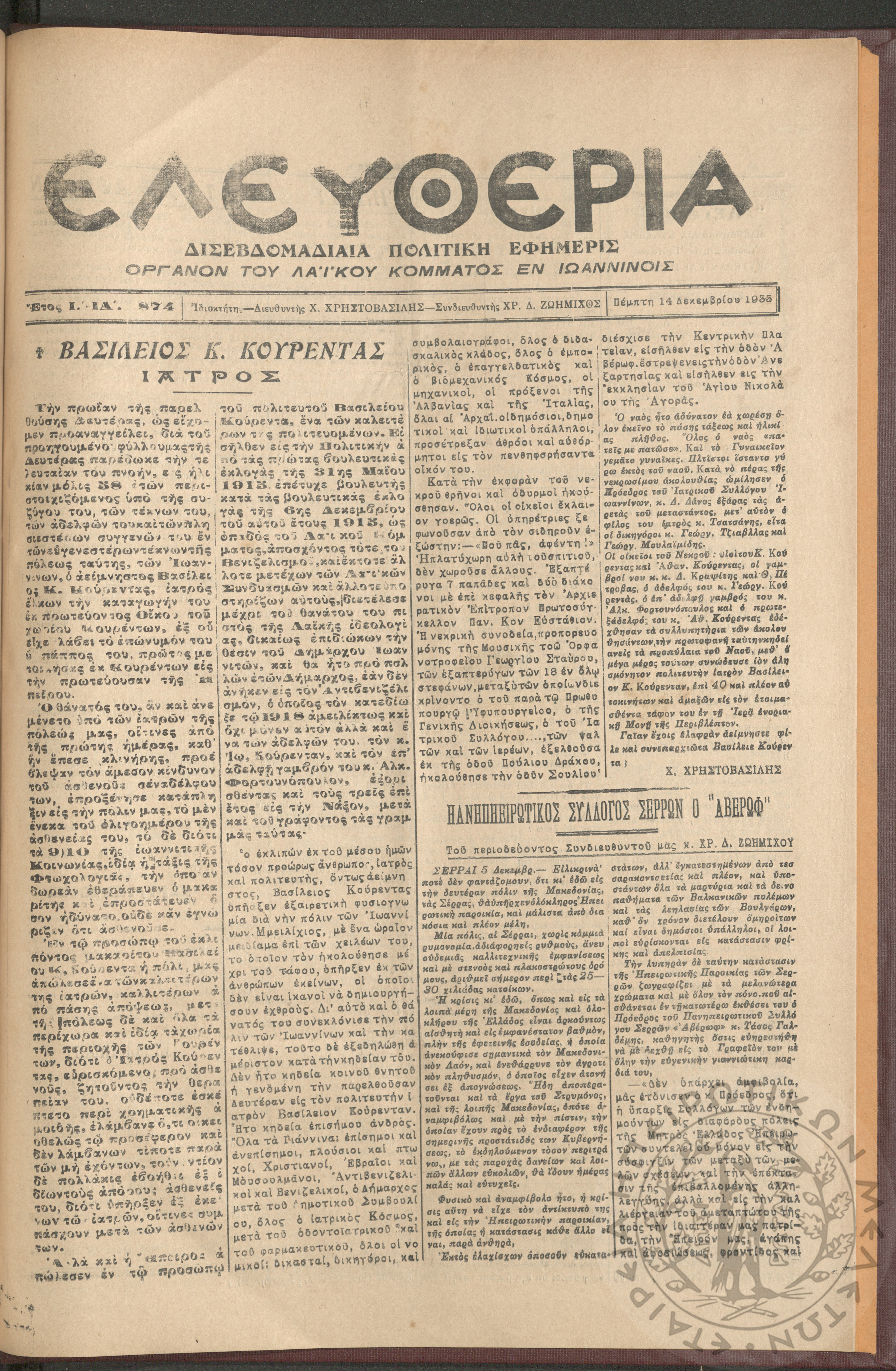 Ελευθερία: δισεβδομαδιαία Ηπειρωτική πολιτική εφημερίς, 1933, φ. 874